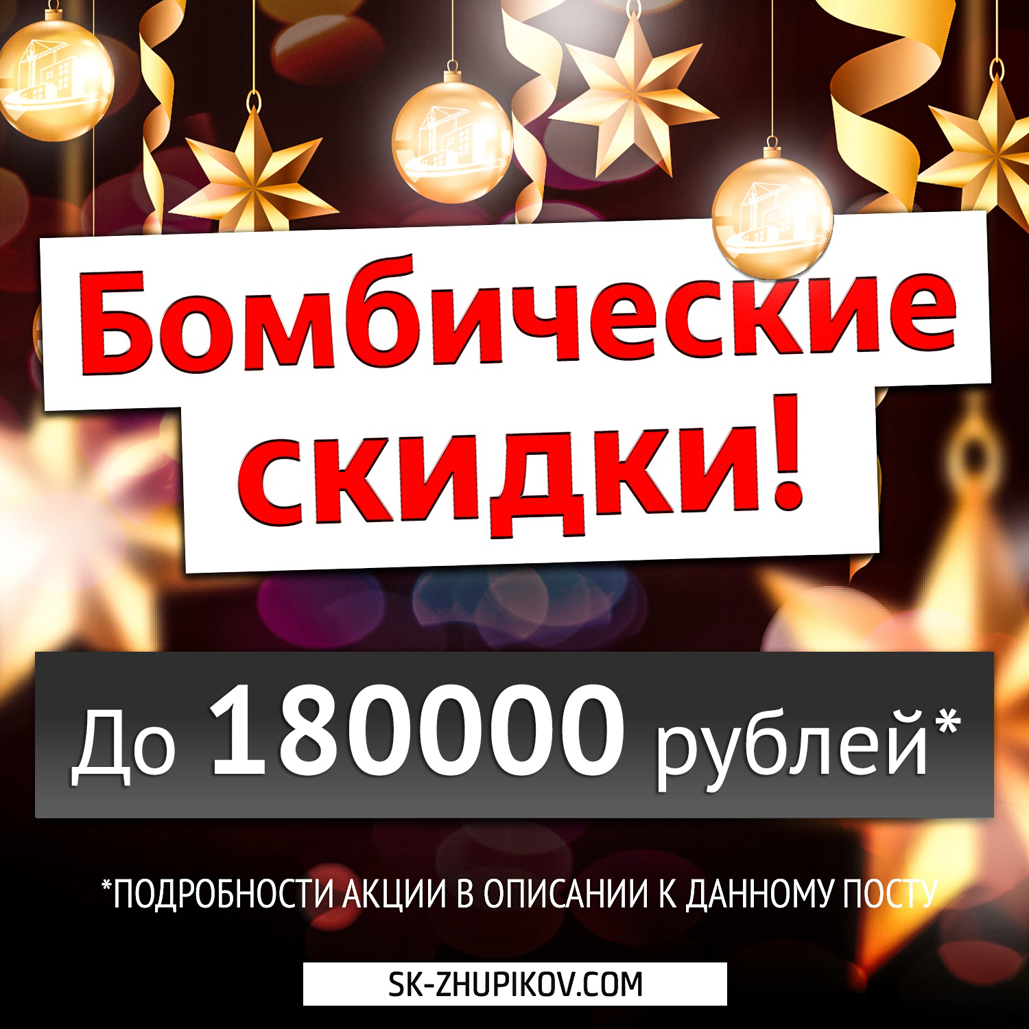 Акция действует с 14.12.2018 по 31.12.2018. Подробности об организаторе акции, и правилах ее проведения, размерах скидок, сроках, месте, порядке их получения по телефону 55-99-53 и у продавцов-консультантов по адресу: Д. Красненькая, Тамбовский район, ул. Совхозная, 210. Срок получения скидок совпадает со сроком проведения акции. Кол-во квартир участвующих в данной акции ограниченно! С проектной документаций объектов участвующих в акции можно ознакомиться на сайте: stag.sk-zhupikov.com Полное наименование застройщика — ООО «Строительная компания Жупиков»
