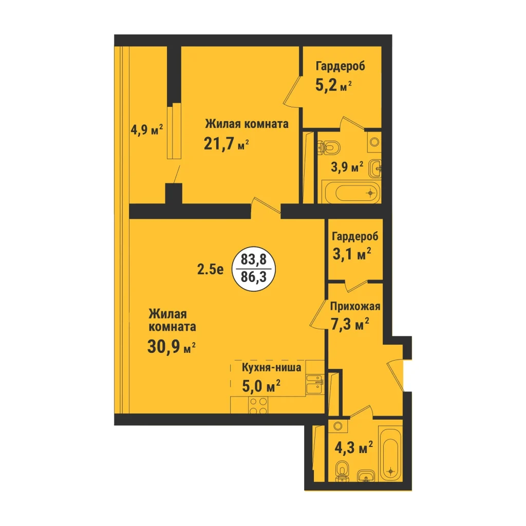 Двухкомнатные квартиры подходят и для одиночного проживания, и для семей с детьми. Несколько санузлов избавят от очереди в ванную, гардеробная спрячет одежду и лишние предметы.