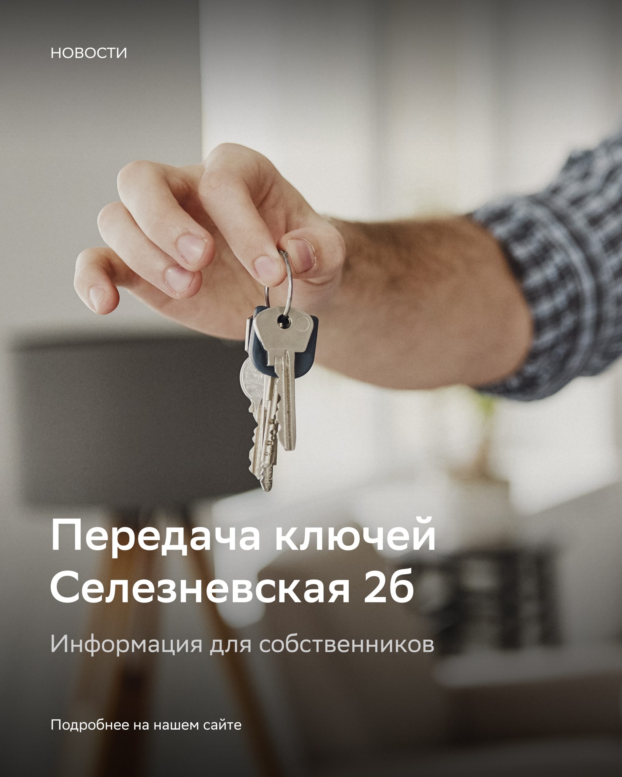 Приглашаем собственников квартир дома Селезневская 2б для передачи ключей. Корпус 3 сдается с 18 по 22 октября, корпус 2 с 25 по 29 число. С собой необходимо взять паспорт, договор долевого участия или другие имеющиеся у вас документы на квартиру.